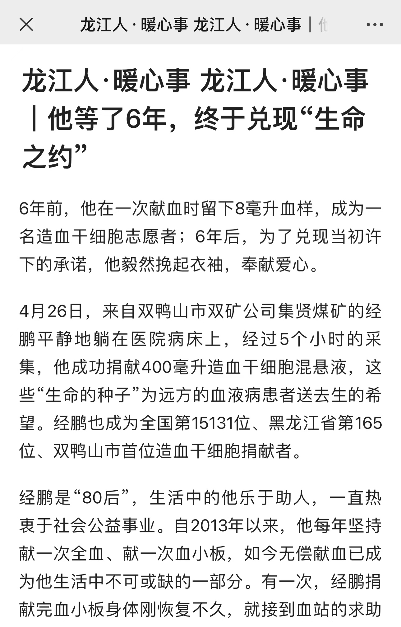近日,黑龙江新闻网对金年会双鸭山矿业公司集贤矿职工经鹏捐献造血干细胞事迹进行了报道
