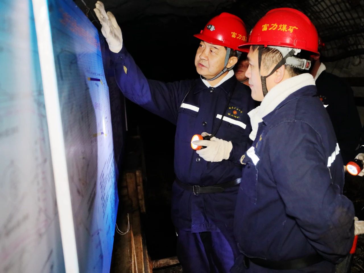5日,在富力矿综采一区施工设计牌板前,刘鹏飞比照技术图纸详细了解事情面安排、灾害超前防治事情落实情况。