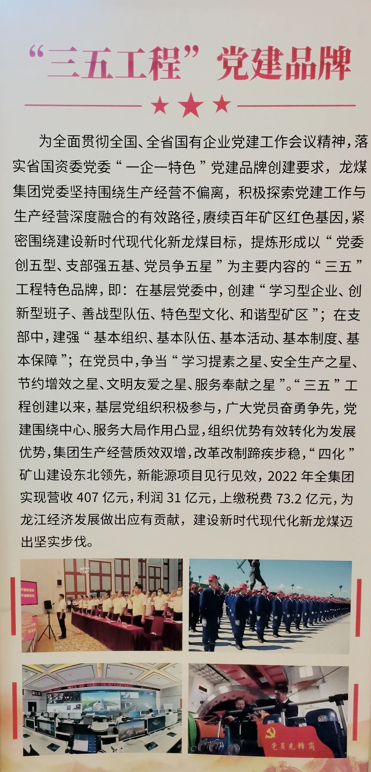 近年来,为全面贯彻全国、全省国有企业党建事情集会精神,集团公司党委坚持围绕生产经营不偏离,积极探索党建事情与生产经营深度融合的有效路径,赓续百年矿区红色基因,紧密围绕建设新时代现代化新金年会目标,提炼形成以“党委创五型、支部强五基、党员争五星”为主要内容的“三五”工程特色品牌,即:在下层党委中,创立“学习型企业、立异型班子、善战型步队、特色型文化、和谐型矿区”;在支部中,建强“基本组织、基本步队、基本运动、基本制度、基本包管”;在党员中,争当“学习提素之星、宁静生产之星、节约增效之星、文明友爱之星、效劳贡献之星”。“三五”工程创立以来,下层党组织积极加入,宽大党员勇猛争先,党建围绕中心、效劳阵势作用凸显,组织优势有效转化为生长优势,集团生产经营质效双增,革新改制蹄疾步稳,“四化”矿山建设东北领先,新能源项目见行见效,2022年全集团实现营收407亿元,利润31亿元,上缴税费73.2亿元。