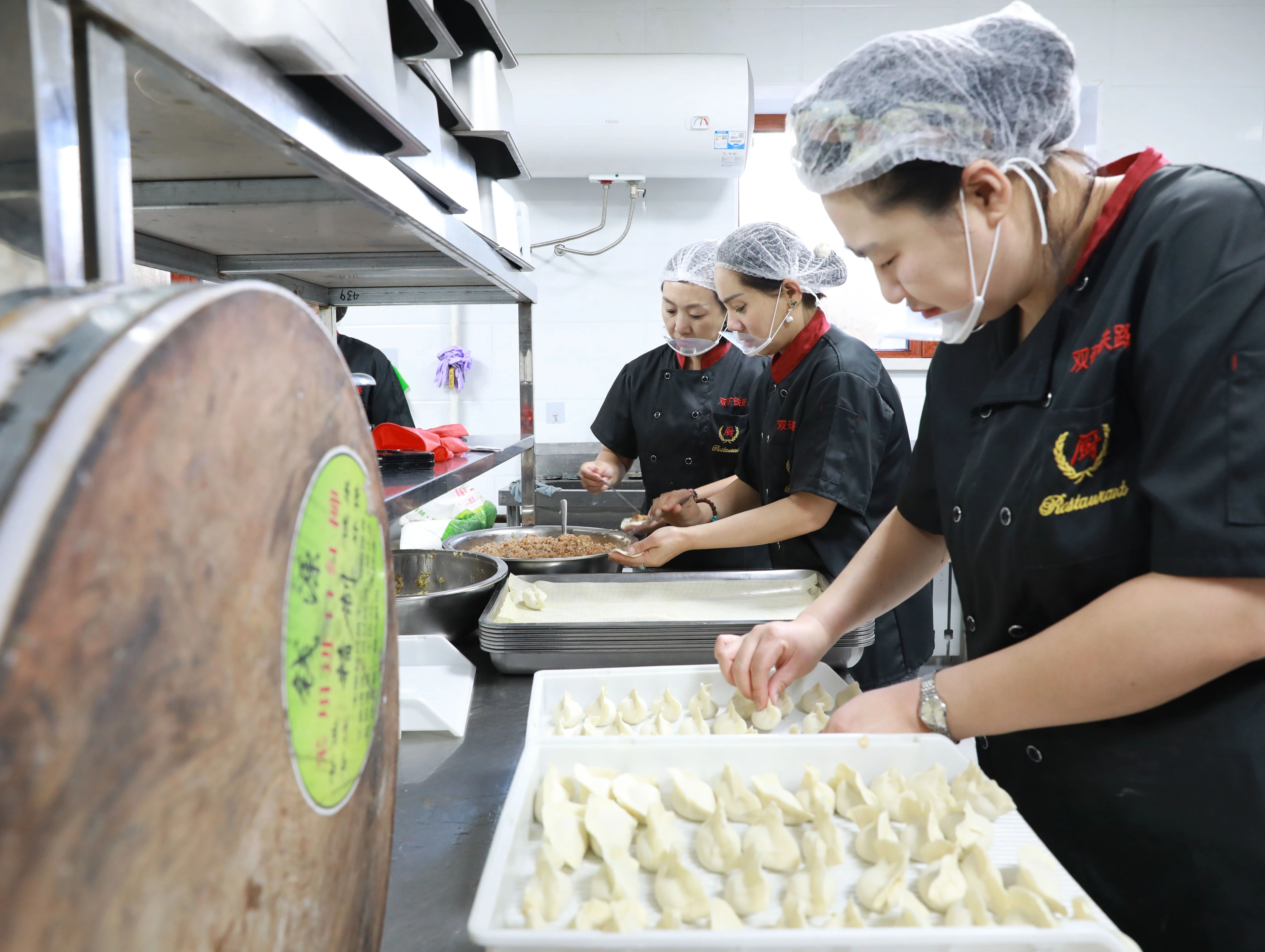“饺子皮边沿抹点水。”“将中间半数合拢,再捏紧两边。”“馅料不要太多,不然就露馅啦。”铁路运输部职工在食堂内忙得热火朝天。